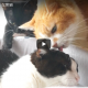 ササミケーキをモリモリ食べる ”まるちゃん” と ”はなちゃん” お顔をあげるこ ...
